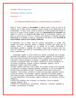 Según la teoría cognitiva de la personalidad, esta se entiende desde las creencias y conceptos que las personas desarrollan. La teoría cognitiva se basa en cómo funciona la mente humana de forma similar a una computadora para explicar la cognición y la variación del comportamiento de las personas dependiendo de las demandas. La psicología cognitiva estudia los procesos mentales como la percepción, memoria y razonamiento. El modelo cognitivo-conductual surge de la combinación del enfoque conductual con la inclusión de la actividad cognitiva como