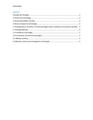 Este documento presenta una introducción a la psicología. Explica que la psicología es la ciencia que estudia la conducta y los procesos mentales humanos y animales. Luego resume brevemente la historia de la psicología y las principales escuelas psicológicas como el conductismo, el cognitivismo y el psicoanálisis. Finalmente, describe los principales campos y métodos de la psicología, incluyendo la psicología básica, la psicología aplicada, la educativa, la clínica y la del