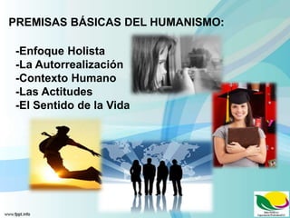 Este documento presenta las premisas básicas del humanismo como el enfoque holístico, la autorrealización, el contexto humano, las actitudes y el sentido de la vida. Explica que el humanismo se enfoca en ver al ser humano de forma integral, en su potencial para desarrollarse a sí mismo, en sus relaciones con los demás y en encontrar significado en la vida.