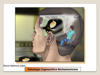 El documento habla sobre el surgimiento de la psicología cognitiva en Norteamérica en 1960 con la publicación de un manifiesto fundacional. Posteriormente, se amplió la analogía entre la mente y la computadora, manejando conceptos como "imágenes mentales" y "planes". La psicología cognitiva estudia procesos como la atención, percepción, memoria y pensamiento.