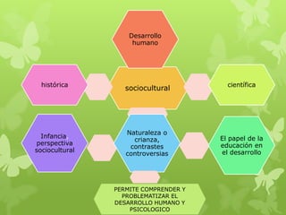 Este documento describe las perspectivas históricas, científicas y socioculturales del desarrollo humano y psicológico. Examina los modelos y teorías psicológicas del desarrollo, especialmente en la infancia, y cómo factores como la educación, la migración y la pobreza afectan el desarrollo de los niños en México. También analiza el papel de la escuela y los maestros en la promoción del desarrollo infantil.