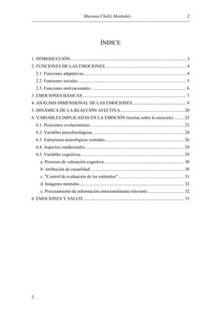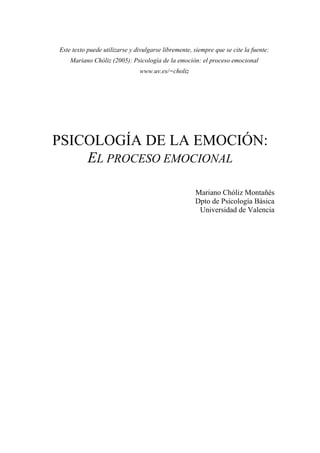 Este documento presenta una introducción a la psicología de la emoción. Explica que la emoción es una experiencia multidimensional que implica respuestas cognitivas, conductuales y fisiológicas. También describe las principales funciones de las emociones, incluyendo funciones adaptativas, sociales y motivacionales. Además, discute teorías sobre la existencia de emociones básicas universales.
