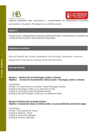 El documento presenta un programa de postítulo en Psicología Forense que se ofrece en Arica. El programa dura dos semestres y cubre temas como la psicología jurídica, el sistema legal, la agresión sexual, la psicopatía, y la elaboración de informes periciales. Se enseñará a través de clases semi-presenciales con una plataforma de aprendizaje y sesiones presenciales los sábados. El programa está dirigido a psicólogos, psiquiatras y estudiantes