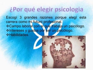Este documento resume las razones por las que Leidy Marcela Cepeda eligió estudiar psicología como su futura carrera profesional. Explica que la psicología ofrece un amplio campo laboral en áreas como la clínica, la educación, la industria y lo social. También describe los intereses y habilidades de Leidy, como su curiosidad por comprender el comportamiento humano y su capacidad de observación y análisis, que la motivan a estudiar esta disciplina.