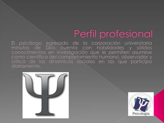 El documento describe las habilidades y conocimientos de un psicólogo egresado de la Corporación Universitaria Minutos de Dios. Un psicólogo puede trabajar en el área clínica evaluando e interviniendo con individuos y grupos para promover la salud mental y el bienestar. También puede trabajar en el área educativa apoyando procesos de enseñanza-aprendizaje en escenarios formales y no formales utilizando herramientas propias de la psicología.