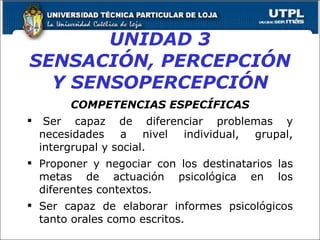 El documento aborda la importancia de la sensación y percepción en el contexto de la psicología, describiendo cómo los órganos sensoriales convierten estímulos en información procesada por el sistema nervioso. Se explican los mecanismos de la percepción, así como los factores que influyen en ella, como motivaciones, expectativas y estados emocionales. Además, se presentan diferentes tipos de receptores sensoriales y fenómenos perceptuales que pueden alterar nuestra interpretación del entorno.
