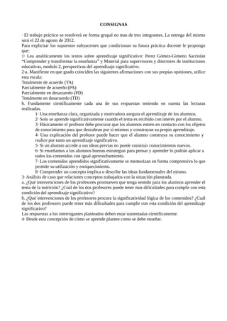 Este documento presenta un trabajo práctico sobre el aprendizaje significativo. Incluye instrucciones para analizar textos sobre este tema, responder preguntas clasificando el grado de acuerdo con afirmaciones sobre cómo se aprende, y analizar casos relacionados con conceptos clave. El estudiante debe fundamentar científicamente sus respuestas basadas en las lecturas, y plantear cómo debería enseñarse desde esta concepción del aprendizaje.