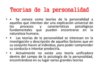 Este documento presenta un resumen de varias teorías de la personalidad como la psicoanalítica, conductista, humanista, transpersonal y prácticas para mejorar la salud mental. Explica brevemente los conceptos clave de cada teoría y sus similitudes y diferencias. Además, propone actividades como hacer ejercicio, meditar y garabatear para entrenar la mente y mantener una buena salud mental.