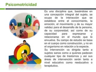 La psicomotricidad se basa en una concepción integral del sujeto y la interacción entre el conocimiento, la emoción, el movimiento y su desarrollo. Se enfoca en el cuerpo como construcción para ayudar tanto a sujetos sanos como con trastornos de manera educativa, reeducativa o terapéutica. Incluye prácticas psicomotrices educativas preventivas, de ayuda terapéutica y acuáticas, con sesiones que consisten en un ritual de entrada y salida con una fase intermedia de expresividad mot