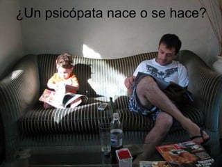 La psicopatía plantea el debate sobre si los psicópatas nacen o se hacen, caracterizándose por la falta de culpa, manipulación y egoísmo. Su conducta se desarrolla a través de experiencias en la familia, amigos y la sociedad, y suelen cometer delitos por placer o venganza. Estas características incluyen ser irresponsables, mentirosos e impulsivos.