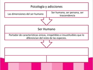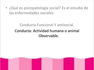 Este documento trata sobre la psicopatología social y la conducta humana. Explica conceptos como conducta funcional, adaptativa, estereotipada y refleja. También aborda temas como la ira, los estados de crisis, la agresión, la resiliencia y los factores de riesgo y protección. Asimismo, analiza la psicología de los grupos, la criminología, la adicción y el papel de la familia en relación con las personas adictas.