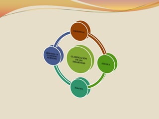 Este documento describe diferentes trastornos del lenguaje y la comunicación como la dislalia, dislalia funcional y orgánica, disglosias como la labial, dental, lingual, palatal y nasal. También describe trastornos de la articulación y expresión del habla, y trastornos del ritmo y la fluidez como la tartamudez y el farfulleo. Explica las causas de la tartamudez como factores neurofisiológicos, genéticos y psicológicos, y cómo diagnosticarla dependiendo de la edad del pac