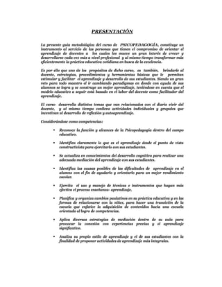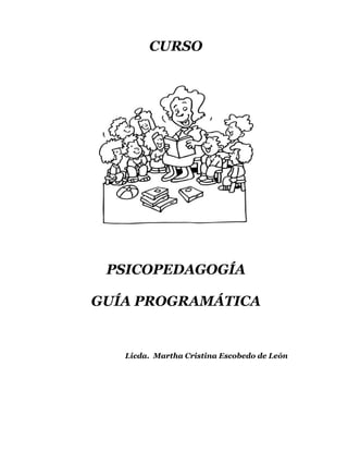 Este documento presenta una guía para un curso de psicopedagogía. El curso busca brindar estrategias y herramientas a los docentes para facilitar el aprendizaje de los estudiantes desde una perspectiva constructivista. El curso cubrirá temas como psicología educativa, destrezas de pensamiento, aprendizaje, disciplina y convivencia. Incluye una lista de materiales a utilizar en cada clase y describe algunas actividades iniciales como dinámicas de integración y conocimiento de sí mismo para los participantes.