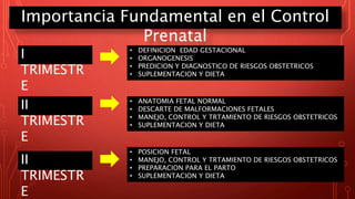 Este documento trata sobre la importancia del control prenatal durante el embarazo. Explica las etapas del embarazo, los riesgos a monitorear en cada trimestre, la nutrición adecuada y los suplementos necesarios. Recomienda una dieta balanceada y ganancia de peso saludable durante el embarazo. Además, identifica alimentos prohibidos y la responsabilidad compartida de la madre y el padre en el cuidado del bebé. En resumen, provee información clave sobre el seguimiento médico y estilo de vida salud