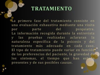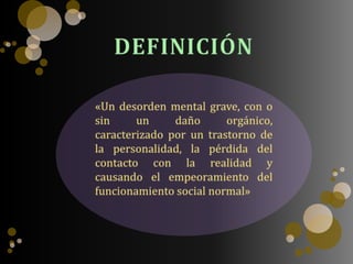 El DSM reconoce varios tipos de psicosis incluyendo la esquizofrenia y trastornos relacionados. Los objetivos del tratamiento son mejorar la expresión y relaciones sociales del paciente, así como promover actividades placenteras. Los neurolépticos se clasifican en típicos y atípicos, siendo estos últimos menos propensos a causar efectos adversos motores, e incluyen fármacos como la clozapina y sulpiride.