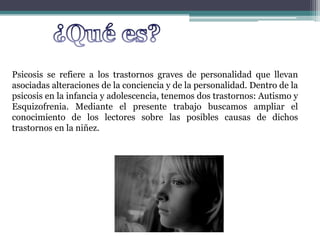 El documento discute la historia y características de las psicosis en la infancia y adolescencia, incluyendo la esquizofrenia y el autismo. Explica que las psicosis infantiles generalmente tienen un inicio insidioso y están más relacionadas con factores genéticos que las psicosis del adulto. También señala que las psicosis infantiles suelen tener un peor pronóstico que las del adulto.