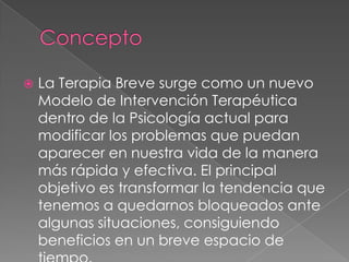 Este documento describe los principios y técnicas de la terapia breve sistémica. Se enfoca en identificar excepciones y mejorías en lugar de problemas, a través de preguntas que ayudan a los clientes a redefinir su situación de manera positiva. El terapeuta busca activamente excepciones pequeñas y construye sobre ellas para promover el cambio.