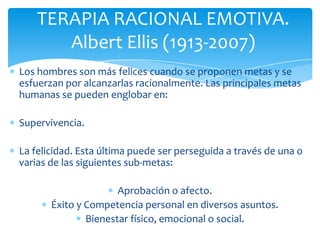 Este documento resume los principios fundamentales de la psicoterapia cognitiva y la terapia racional emotiva. Explica que los pensamientos, sentimientos y comportamientos están interrelacionados, y que las creencias irracionales contribuyen a los trastornos psicológicos, mientras que las creencias racionales promueven la salud mental. También describe cómo la terapia cognitiva se basa en la premisa de que la percepción y estructura cognitiva de una persona determinan sus emociones y acciones.