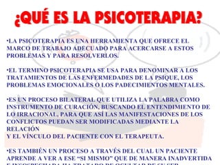 Este documento describe diferentes tipos de psicoterapia, incluyendo terapias superficiales, conductuales, existenciales, gestalt y rogerianas. Explica que la psicoterapia psicoanalítica busca resolver las dificultades internas del paciente para promover su desarrollo y maduración, mientras que el psicoanálisis implica una exploración más profunda del inconsciente.