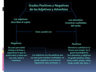 Este documento explica los diferentes grados de los adjetivos y adverbios en español: positivo, comparativo, superlativo y de igualdad. Define cada grado y proporciona ejemplos para ilustrar sus usos. En resumen, describe las formas de expresar cualidades y cantidades en diferentes niveles de comparación.