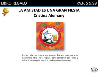 El documento presenta una colección de libros de la serie Snoopy de Charles Schulz. Los libros tratan sobre temas como la amistad, el amor, la felicidad, el optimismo y los juegos. Cada libro contiene frases e ilustraciones de Snoopy y sus amigos para celebrar y reflexionar sobre diferentes valores. Los libros son destinados a niños y fans de todas las edades.