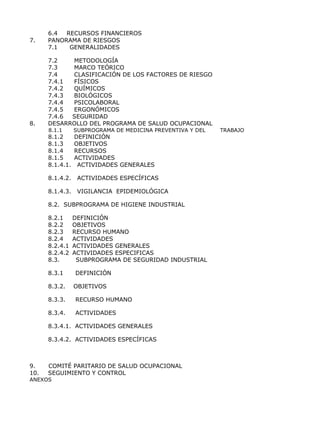 Este documento presenta una propuesta para el programa de salud ocupacional de la empresa Dentisanar ESP. Describe los objetivos del programa, los antecedentes legales, las responsabilidades de la gerencia, el coordinador y los trabajadores. Además, proporciona información general sobre la empresa como su actividad económica, número de trabajadores, jornada laboral, estructura organizacional, materia prima, seguridad social, misión y visión. Finalmente, presenta las políticas de la empresa en materia de salud ocupacional.