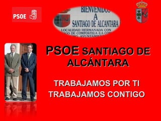 El documento presenta las propuestas del PSOE para la localidad de Santiago de Alcántara, incluyendo inversiones en infraestructura, cultura, deporte, turismo, empleo, medio ambiente y servicios para residentes. Se detallan proyectos para mejorar instalaciones deportivas y culturales, crear un centro de interpretación megalítico, impulsar el turismo rural, construir una residencia para mayores y viviendas, y ampliar servicios como guardería, centro de salud y polideportivo.