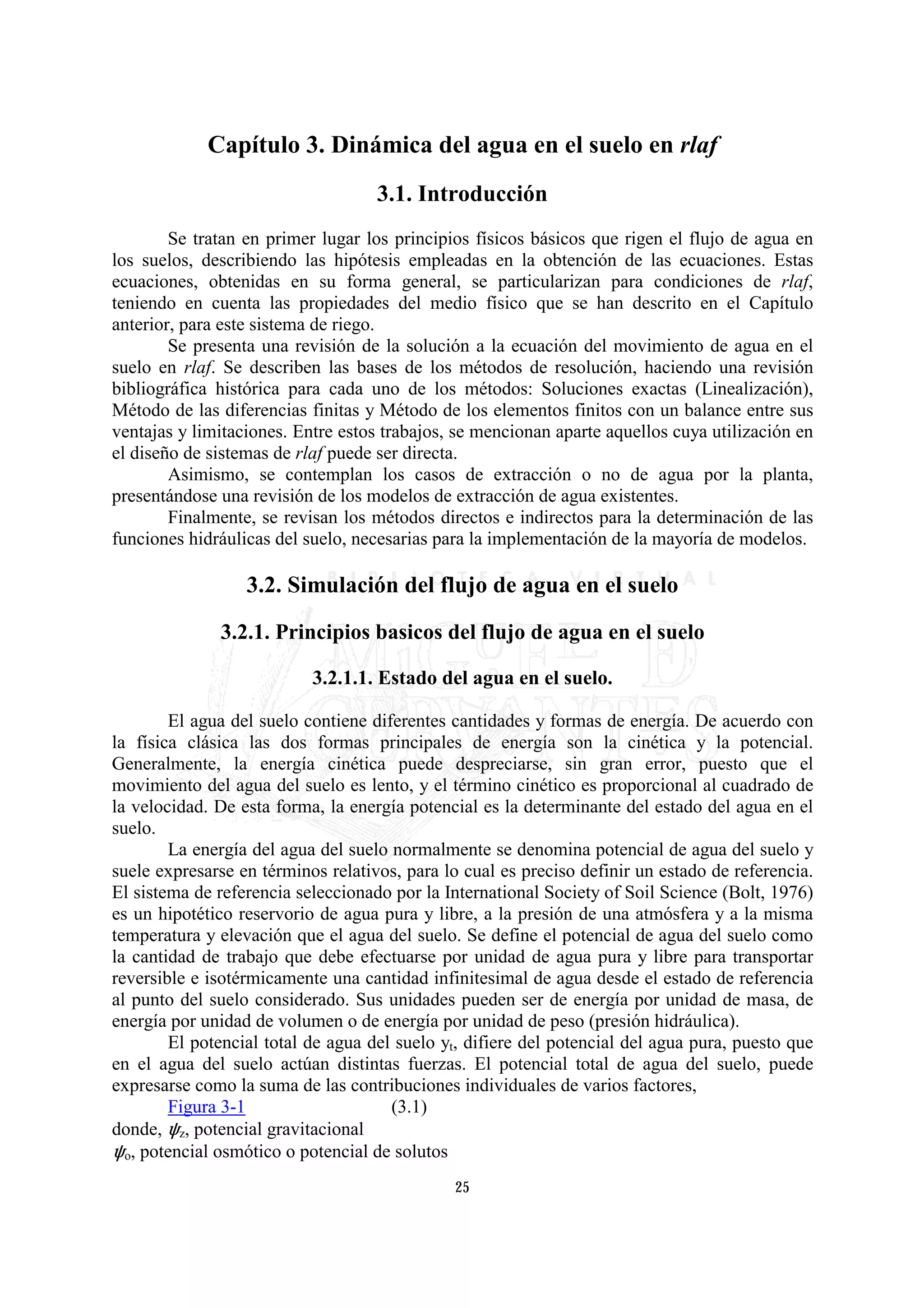 Este capítulo describe los principios básicos del flujo de agua en el suelo y presenta la ecuación general de flujo de Richards. Se revisan los métodos para resolver esta ecuación y se discuten las condiciones de validez, como la histéresis y la dependencia de la conductividad hidráulica de factores como la temperatura y la salinidad. Finalmente, se aplica la ecuación general al riego por goteo.