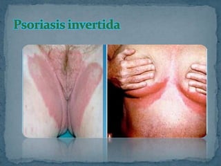La psoriasis es una enfermedad inflamatoria crónica de la piel caracterizada por placas eritematosas y escamosas. Afecta entre el 2-3% de la población mundial y se manifiesta más comúnmente en la piel cabelluda, codos, rodillas y espalda. Existen diferentes tipos de psoriasis que varían en función de la localización y características de las lesiones. No tiene cura, pero existen tratamientos para controlar los síntomas y brotes.