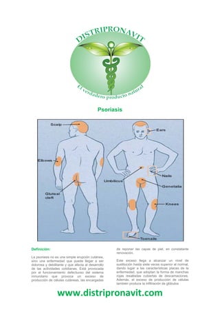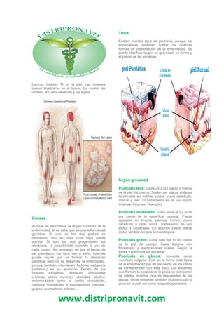 La psoriasis es una enfermedad crónica de la piel causada por un funcionamiento defectuoso del sistema inmunitario que provoca un exceso de producción de células cutáneas. Puede manifestarse en forma de placas rojas escamosas en diversas partes del cuerpo y en algunos casos puede estar asociada con artritis. Existen varios tipos de psoriasis que difieren en gravedad, forma y patrón de lesiones. El tratamiento depende del tipo y gravedad e incluye cremas tópicas, fototerap