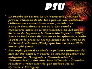 La Prueba de Selección Universitaria (PSU) es la prueba utilizada desde 2003 por las universidades chilenas para seleccionar a sus postulantes. Consta de cuatro pruebas obligatorias y electivas de Lenguaje, Matemática, Historia y Ciencias. Aunque se concibió como transitoria hasta la implementación de un nuevo sistema, la PSU sigue siendo la prueba principal de ingreso a la educación superior en Chile.