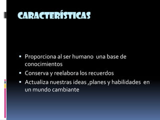La memoria es la capacidad de recordar hechos y eventos pasados. Tiene tres funciones principales: recoger información, organizarla y recuperarla. Existen diferentes tipos de memoria clasificados por su duración, como la memoria sensorial de corta duración, la memoria inmediata de menos de un minuto, la memoria reciente de minutos a semanas, y la memoria remota que puede durar toda la vida.