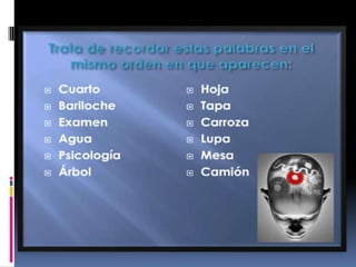 La memoria es la capacidad de recordar hechos y eventos pasados. Tiene tres funciones principales: recoger información, organizarla y recuperarla. Existen diferentes tipos de memoria clasificados por su duración, como la memoria sensorial de corta duración, la memoria inmediata de menos de un minuto, la memoria reciente de minutos a semanas, y la memoria remota que dura desde semanas a toda la vida.