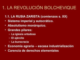 Este documento resume el periodo de entreguerras de 1919 a 1939. Detalla la revolución bolchevique en Rusia que derrocó al gobierno zarista e instauró el primer estado comunista bajo Lenin. Luego describe la guerra civil rusa y la formación de la Unión Soviética en 1922. Finalmente, explica la prosperidad económica de los "Felices Años Veinte" en Estados Unidos y Europa antes del Crack bursátil de 1929 y la Gran Depresión.