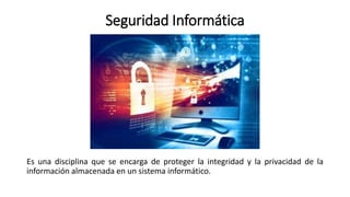 El documento habla sobre conceptos de seguridad informática como firewalls, antivirus, seguridad en redes wifi, formas de proteger las redes wifi, copias de seguridad, correo spam, programas P2P, virus y ejemplos de virus. Concluye que se requieren acciones de concientización, capacitación y difusión de mejores prácticas para hacer frente a las constantes amenazas a los sistemas.