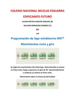 El documento describe tres experimentos de movimiento realizados con un robot Lego Mindstorms NXT. En el primer experimento, el robot se mueve en línea recta y luego gira 45 grados antes de continuar recto. En el segundo, el robot gira 360 grados sobre su eje central. En el tercer experimento, el robot sigue un movimiento ondulante en línea recta.