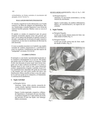 Este documento provee una revisión del pterigión, incluyendo su epidemiología, patogénesis, hallazgos histopatológicos, cuadro clínico, diagnóstico diferencial y tratamiento. Explica que el pterigión es causado por exposición prolongada a la radiación solar y ocurre con más frecuencia en climas cálidos. Describe las características clínicas y histológicas de la enfermedad y provee pautas para su manejo médico o quirúrgico dependiendo de factores como tamaño