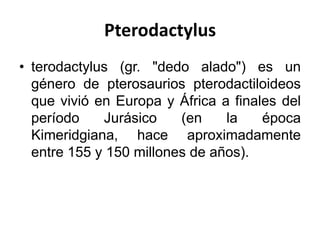 Pterodactylus fue un género de pterosaurio pequeño que vivió en Europa y África hace entre 155 y 150 millones de años, tenía un ala de entre 50 y 75 cm de envergadura, cabeza pequeña con pico puntiagudo y dientes, cuerpo y alas livianas, cuello largo y cola corta, y habitaba en orillas de lagos donde se alimentaba de peces debido a su dieta carnívora.