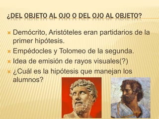 Este documento resume conceptos clave de óptica geométrica, incluyendo que la luz se propaga en línea recta, puede reflejarse o refractarse, y que la velocidad y el índice de refracción varían entre medios. También explica las leyes de la reflexión y refracción de Snell, así como propiedades como el espectro electromagnético y los índices de refracción de varios materiales.