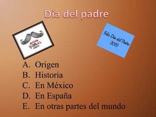 El Día del Padre celebra la influencia de los padres en la sociedad y se enfoca en agradecer su presencia y cuidado. Se originó en Estados Unidos en 1912 para complementar el Día de la Madre, y muchos países ahora lo celebran el tercer domingo de junio, aunque algunos en otras fechas. En México se celebra el tercer domingo de junio para agradecer la presencia y cuidados de los padres.