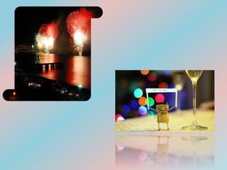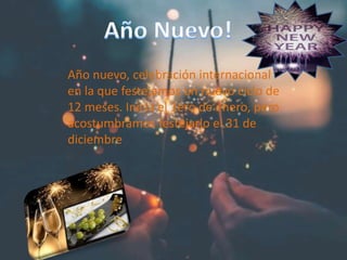 El documento habla sobre las tradiciones y celebraciones del Año Nuevo. Describe cómo el Año Nuevo marca el comienzo de un nuevo ciclo de 12 meses y es generalmente celebrado el 31 de diciembre. Explica algunas tradiciones como comer 12 uvas al sonar las campanadas de medianoche mientras se escucha un poema, y también festejar con música, comida típica y fuegos artificiales; particularmente en Venezuela y Colombia. Además, menciona que en otras partes del mundo las celebraciones incluy