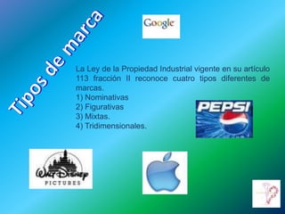 La Ley de la Propiedad Industrial en México reconoce cuatro tipos de marcas: 1) nominativas como "NIKE" que usan solo palabras, 2) figurativas que usan solo diseños, 3) mixtas que usan palabras y diseños juntos, y 4) tridimensionales para empaques y envases de forma distintiva.