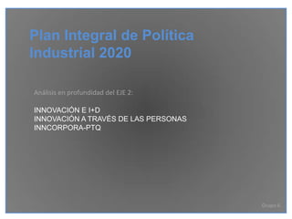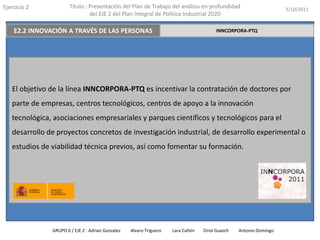 Este documento describe el programa INNCORPORA-PTQ del Plan Integral de Política Industrial 2020 de España. El programa ofrece subvenciones para la contratación de doctores por parte de empresas e instituciones para trabajar en proyectos de I+D. Las subvenciones cubren el salario y la seguridad social de los doctores, así como hasta 3.000€ para su formación en gestión de la innovación. El programa tiene como objetivo incentivar la investigación e innovación a través de la contratación de personal altamente cualificado.
