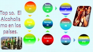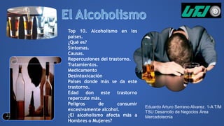El documento resume el alcoholismo, incluyendo sus síntomas, causas, tratamientos y países donde es más común. Define el alcoholismo como la incapacidad de controlar el consumo de alcohol debido a una dependencia física y emocional. Explica que los tratamientos incluyen desintoxicación y medicamentos, y que el alcoholismo afecta más a las mujeres que a los hombres dependiendo de factores como la composición corporal.