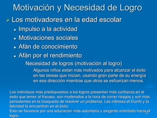El documento resume los principales conceptos relacionados con el desarrollo socioemocional en la edad escolar, incluyendo la motivación y necesidad de logro, la autoestima, las habilidades sociales, la agresividad y el bullying. También describe las etapas de la pubertad y la adolescencia que marcan la transición a la juventud.