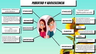 Este documento describe los cambios físicos, psicológicos y sociales que ocurren durante la pubertad y la adolescencia. Explica que la pubertad marca el inicio de la capacidad reproductiva con el desarrollo de los caracteres sexuales secundarios entre los 8-14 años. La adolescencia es el periodo entre la infancia y la edad adulta que incluye cambios intensos que moldean la personalidad y los proyectos de vida. Define tres etapas de la adolescencia y los roles de las hormonas en los cambios del cuerpo.