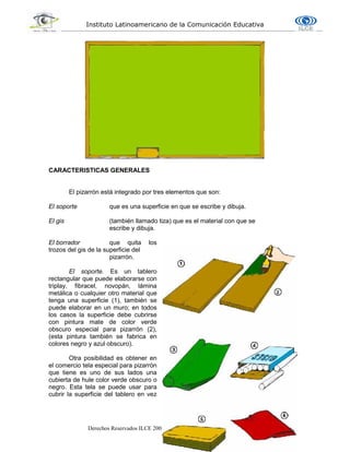 El documento es un manual sobre la elaboración y uso del pizarrón en la educación, destacando su antigüedad, facilidad de uso y bajo costo. Se describen sus características, tipos, ventajas y el proceso de construcción, enfatizando su importancia en el aula como medio de comunicación. Además, se presentan recomendaciones para su ubicación y técnicas de escritura, contribuyendo a una enseñanza más efectiva.