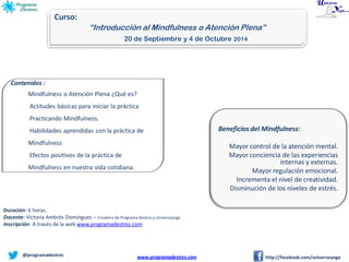 El documento presenta un curso de introducción al mindfulness impartido por Victoria Ambrós Domínguez, que se lleva a cabo en marzo y octubre de 2014. Se destacan los beneficios del mindfulness, que incluyen un mayor control de la atención, conciencia, regulación emocional, creatividad y reducción del estrés. El curso tiene una duración de 6 horas y se ofrece a través de la web de programa destres.