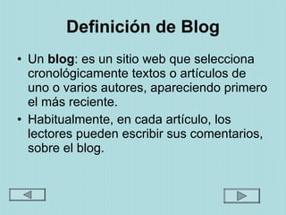 Este documento proporciona una definición de blog y lista algunos portales gratuitos populares para crear uno como Blogger, Blogspot y Bloggy. Explica los pasos básicos para crear un blog en Blogger, que incluyen crear una cuenta de Gmail, seleccionar una plantilla y crear una página de blog directa.
