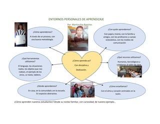 El documento explora preguntas sobre cómo, dónde y con quién aprendemos, así como cómo enseñamos y qué herramientas y recursos utilizamos para el aprendizaje. Explica que aprendemos a través de un proceso metódico en entornos como el hogar, la escuela y la comunidad, con la familia, amigos, maestros y medios de comunicación, así como de nuestra propia experiencia.